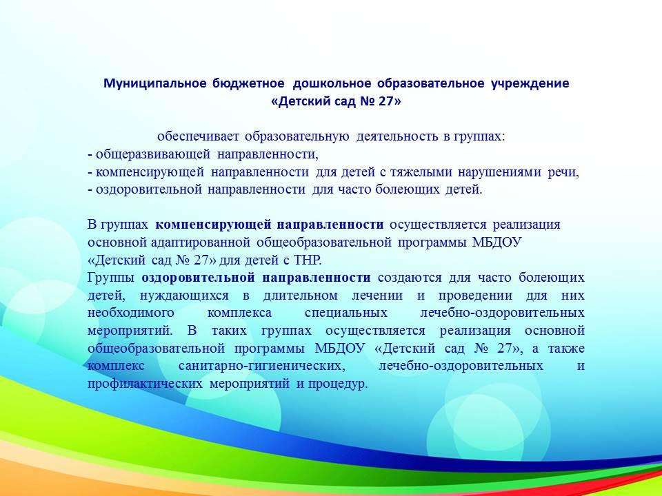 В ДОУ работают 35 групп: из них группы компенсирующей направленности для детей с общим недоразвитием речи, для детей раннего возраста и общеразвивающей направленности.